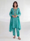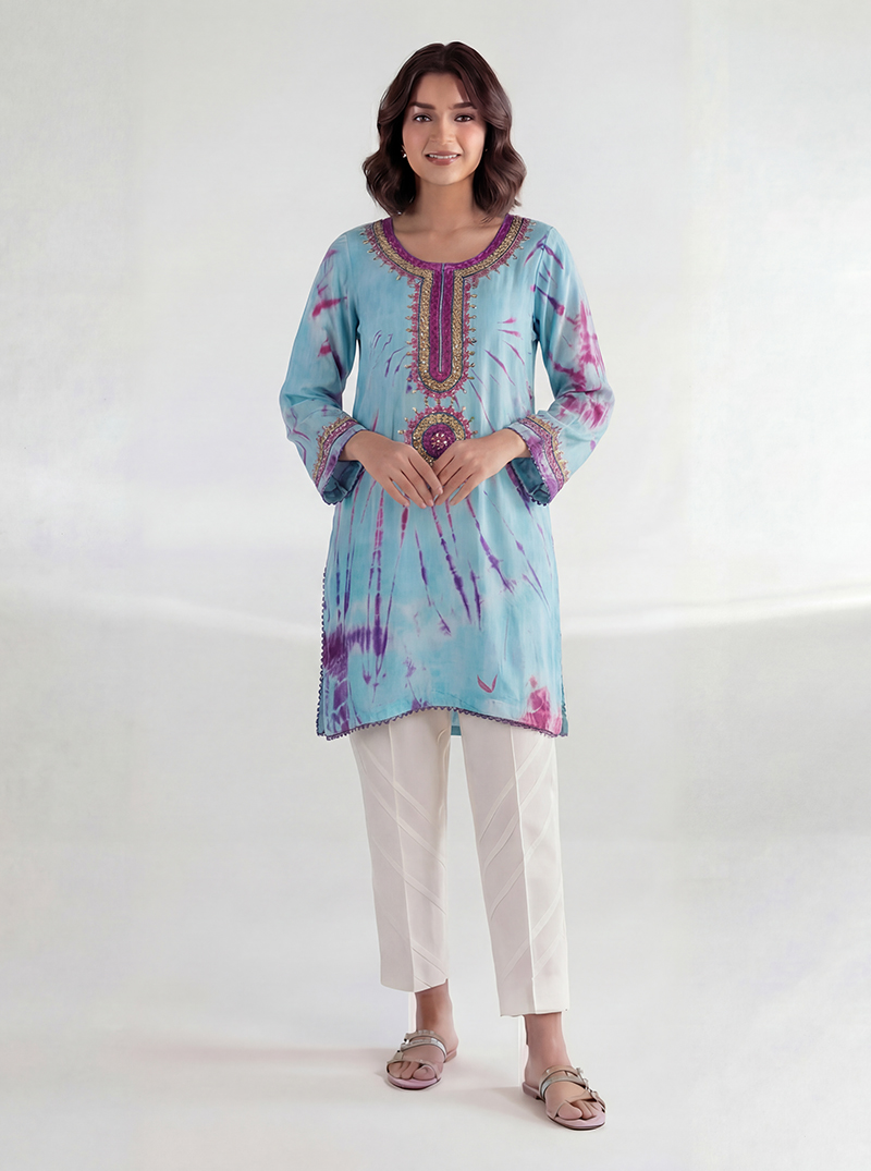 Cotton silk tie-dye kurta with gota, sequins, and silk thread embroidery.