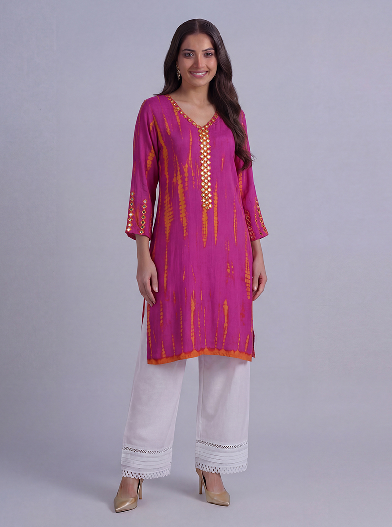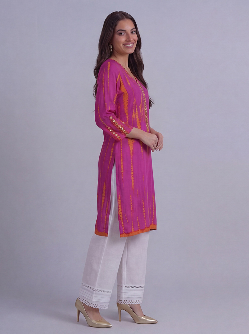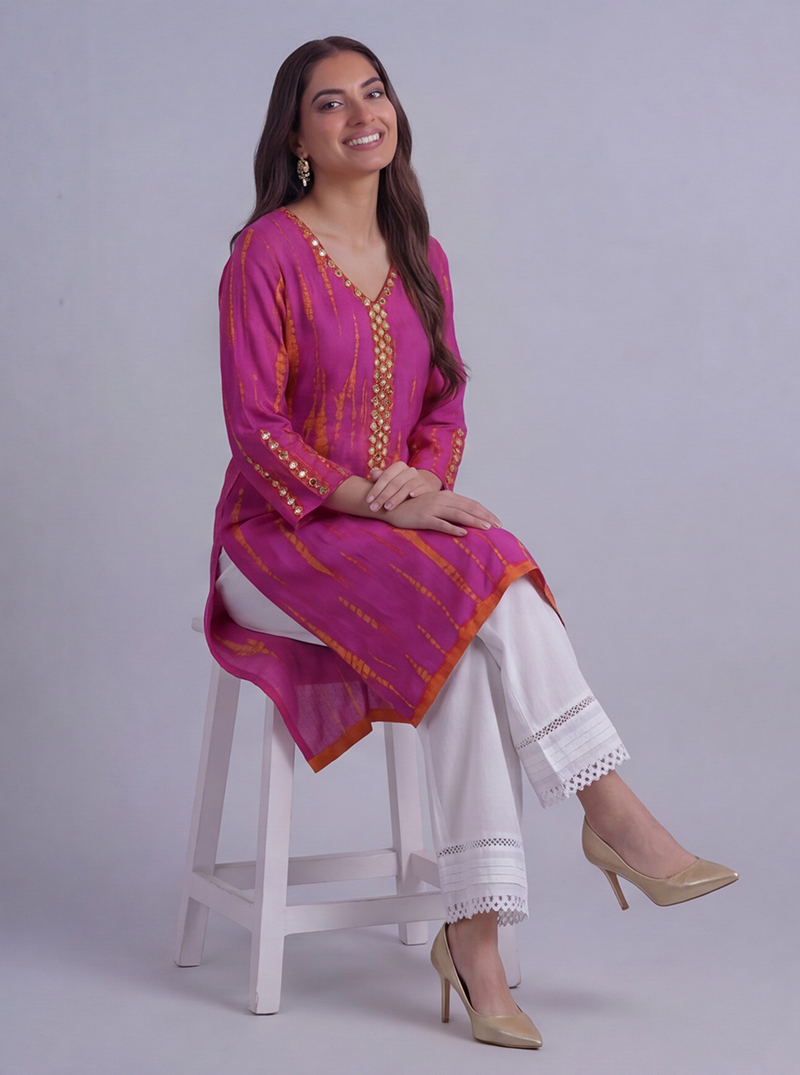Pink color in the town, linen tie-dye shirt with mirror work.