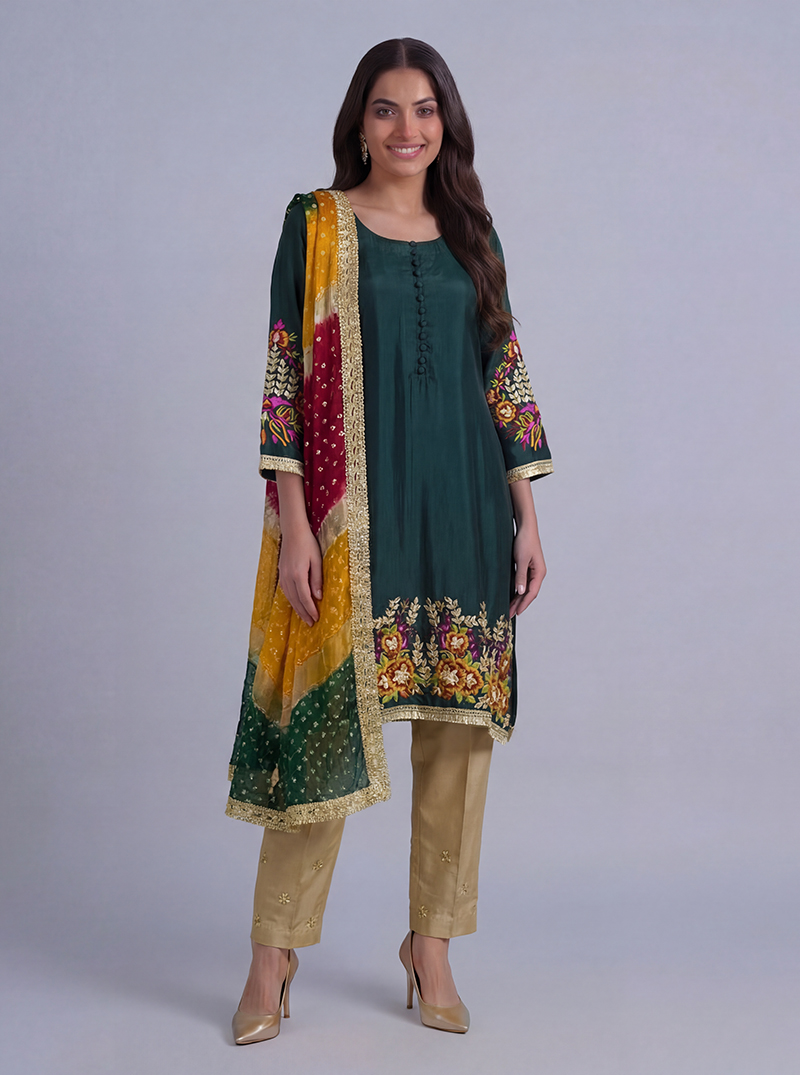 Crafted in radiant green bandhani silk and adorned with fine gota work, this design celebrates the beauty of intricate craftsmanship ideal for special occasions.