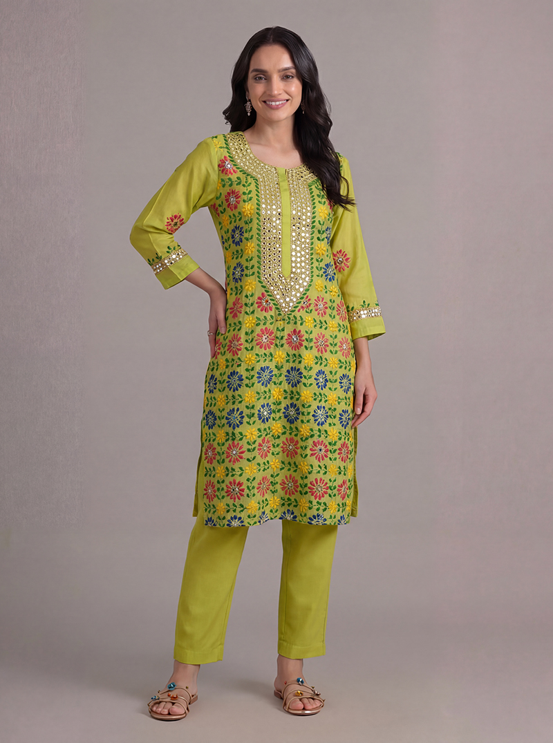 A chiffon Phulkari suit that beautifully blends traditional Indian embroidery with modern fabric.