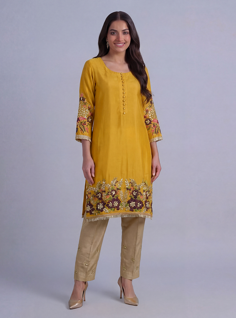 Crafted in radiant Mustard Bandhani silk and adorned with fine gota work, this design celebrates the beauty of intricate craftsmanship ideal for special occasions.