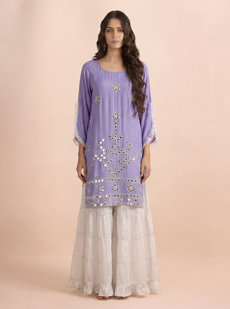 Paired with our signature Sharara Pant and an embroidered net dupatta for a timeless festive look.