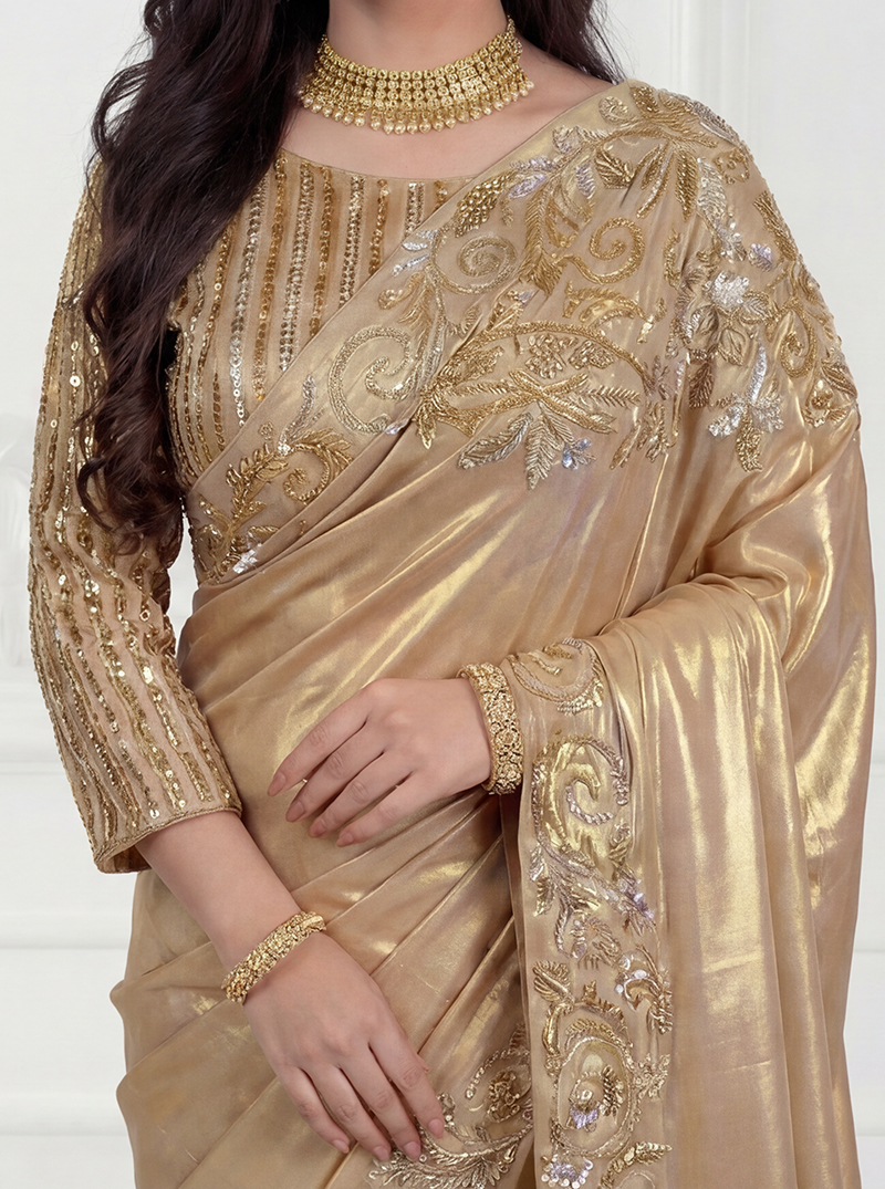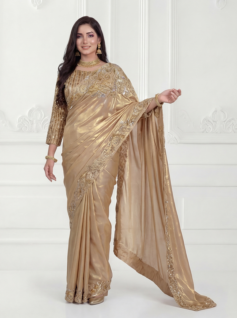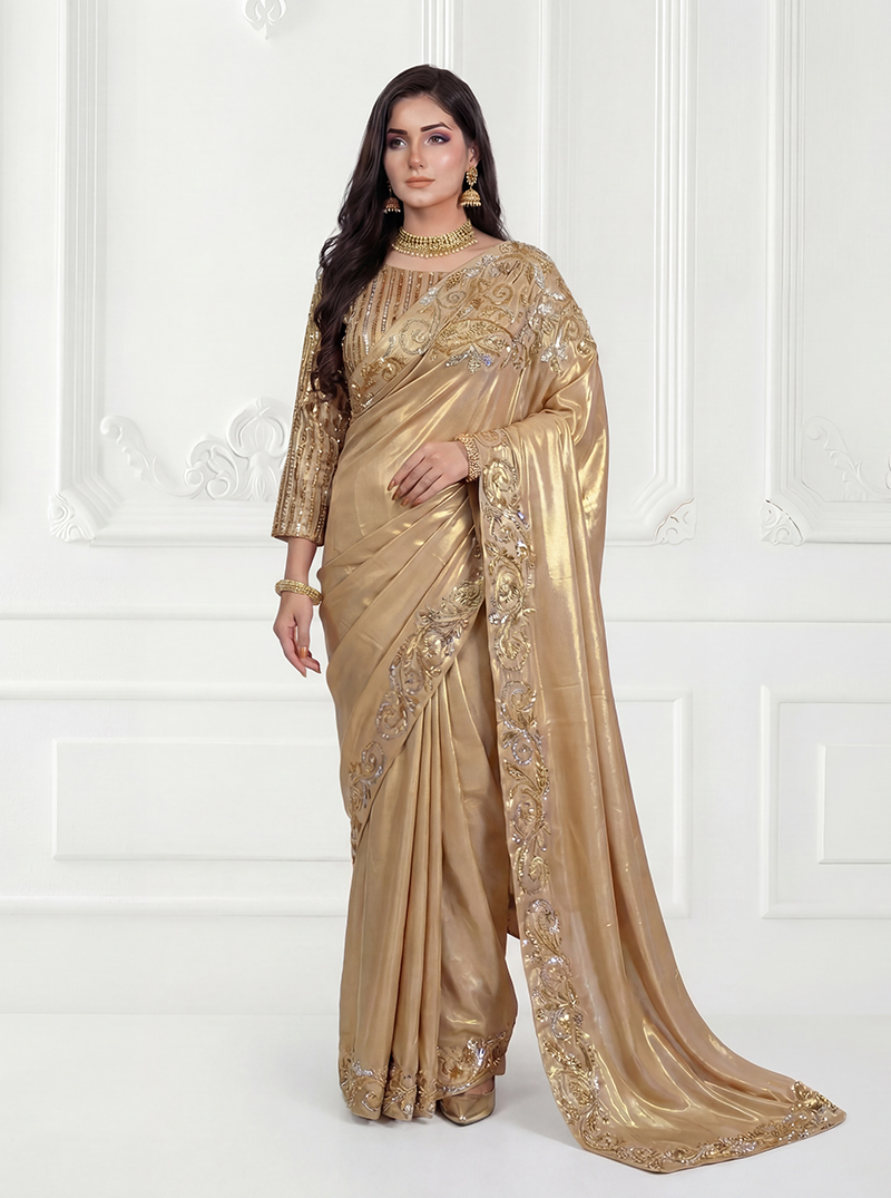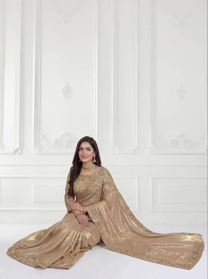 Luxury gold shimmer saree featuring intricate hand embroidery detailing. Designed with a heavily embellished border and statement pallu, this antique gold bridal saree is perfect for nikkah, reception, and formal wedding ceremonies. A timeless bridal ensemble combining regal craftsmanship with modern elegance.