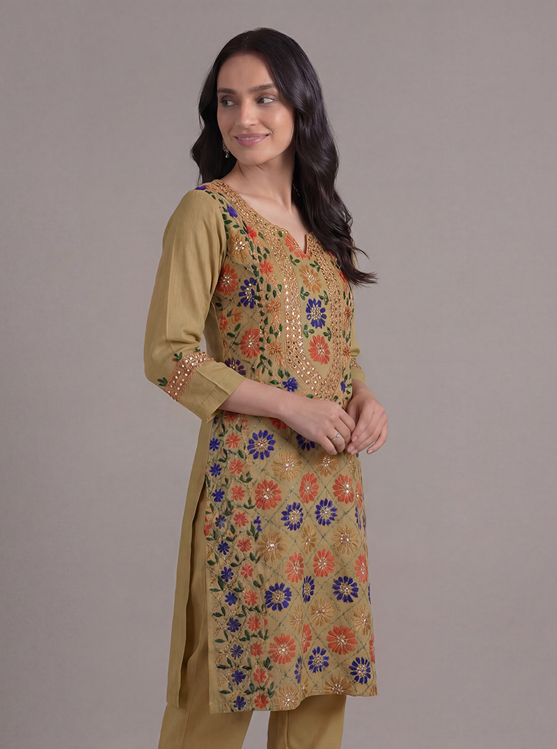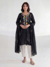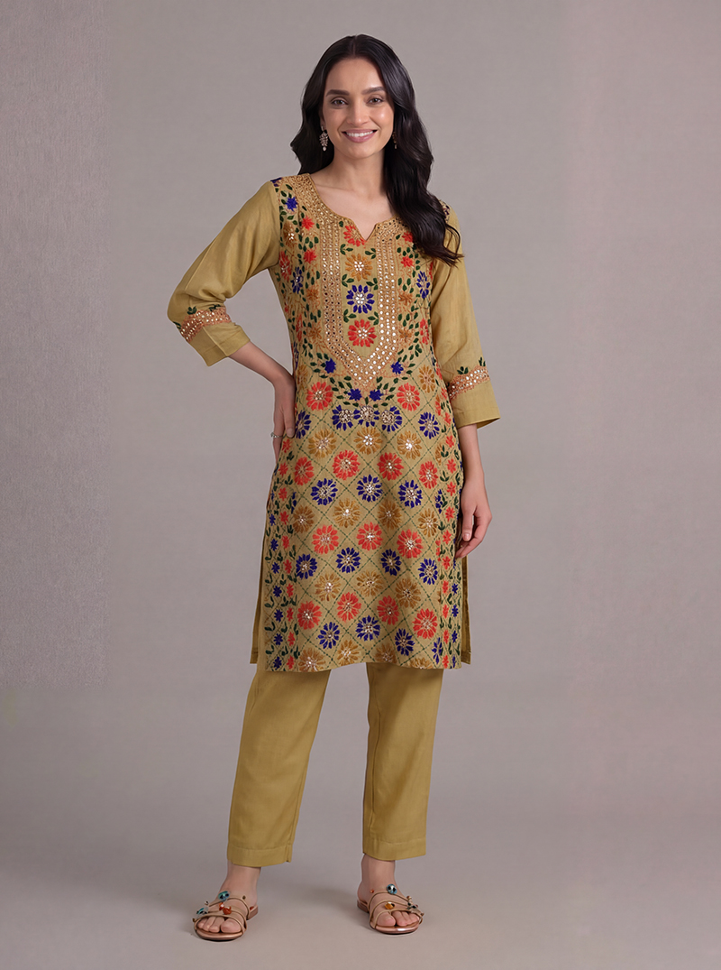 A chiffon Phulkari suit that beautifully blends traditional Indian embroidery with modern fabric.