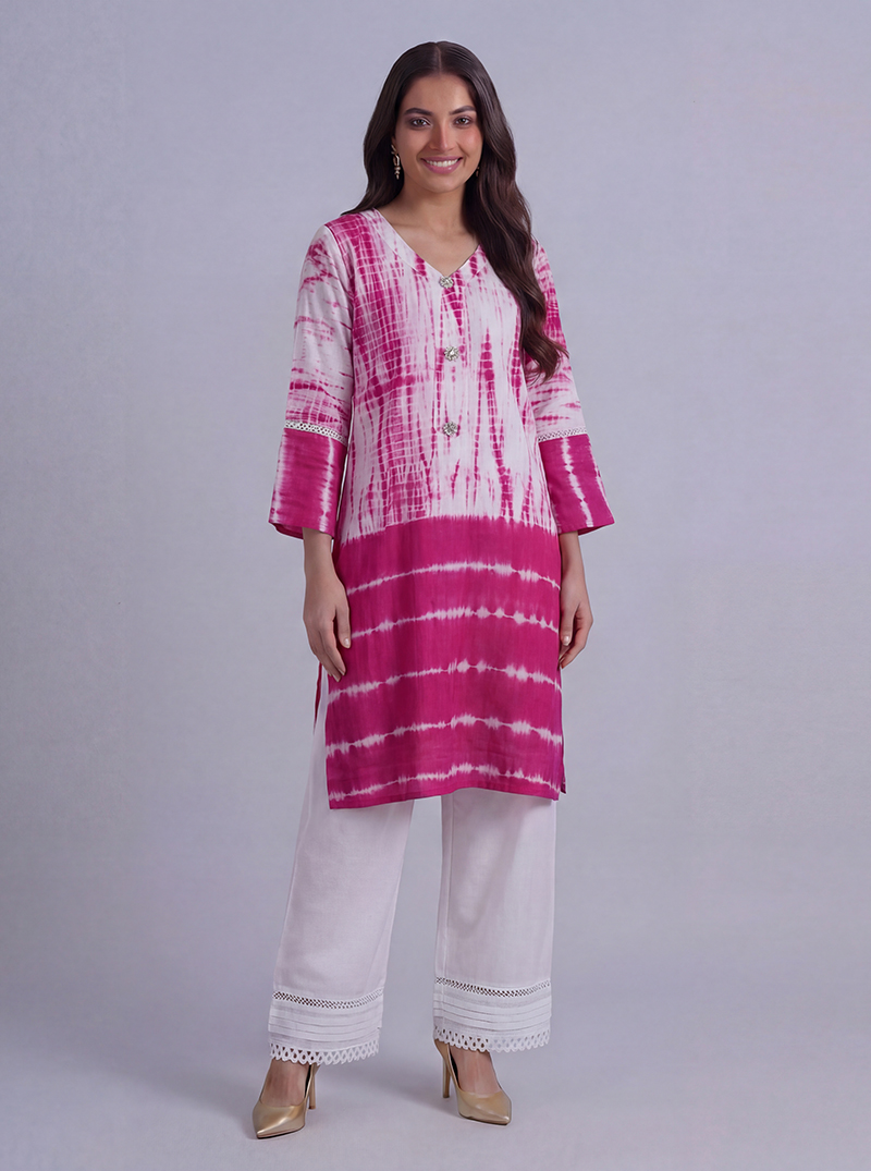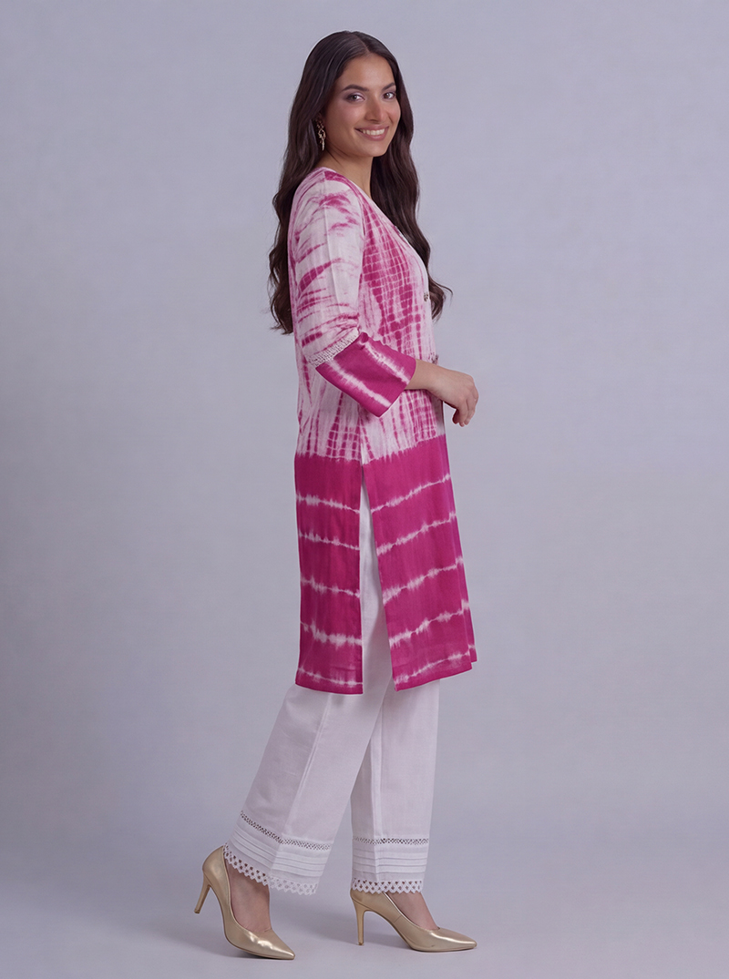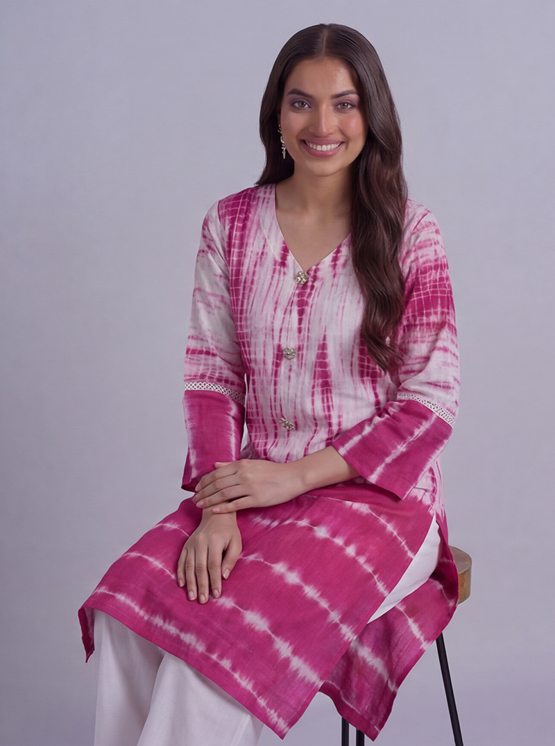 Pink color tie and dye with pearls buttons embellished Ready To Wear shirt.