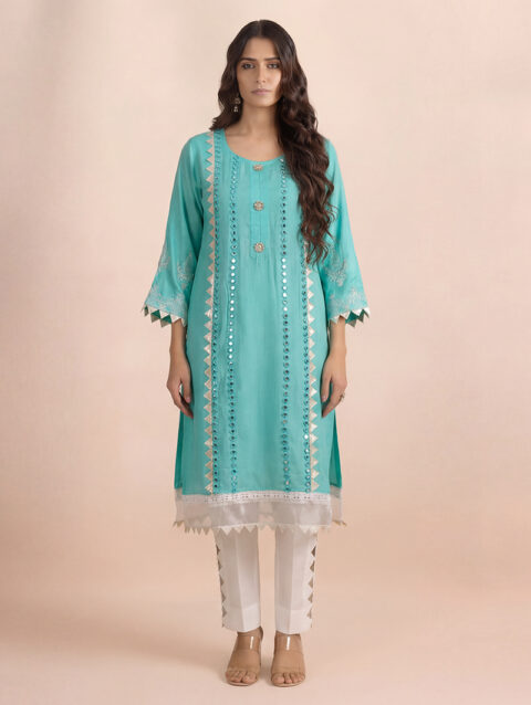 Our hot-selling Rawsilk kurta adorned with intricate mirror embroidery