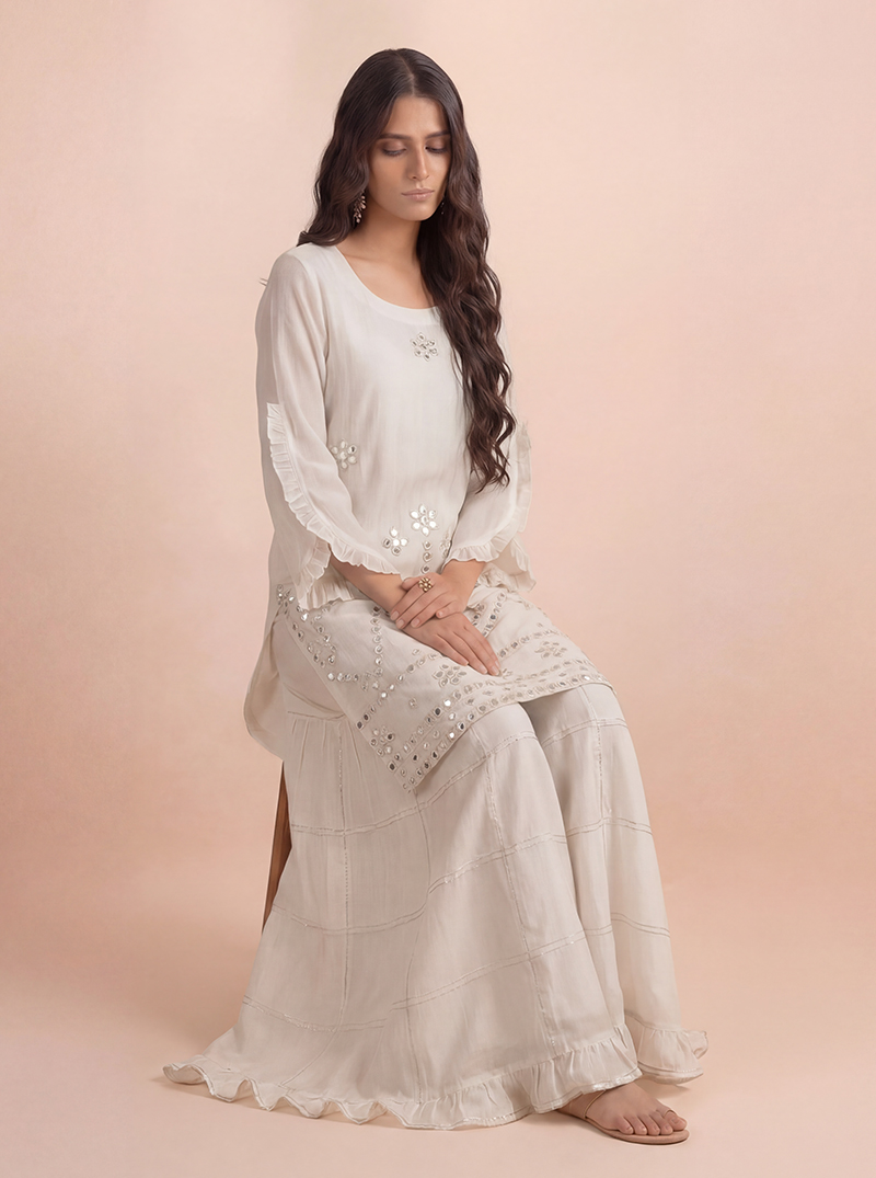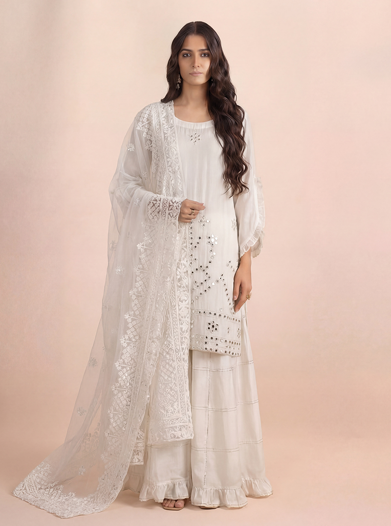 Paired with our signature Sharara Pant and an embroidered net dupatta for a timeless festive look.