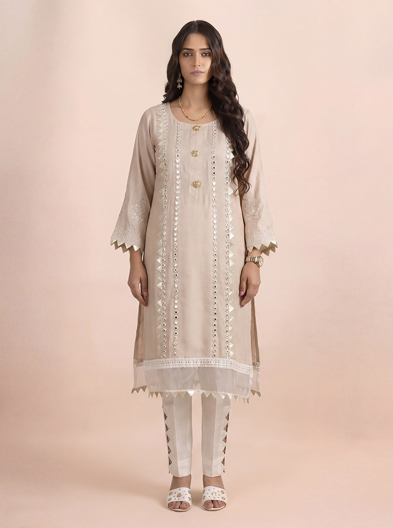 Sandy brown linen thread and mirror work embellished ready to wear kurta