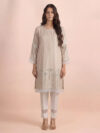 Sandy brown linen thread and mirror work embellished ready to wear kurta