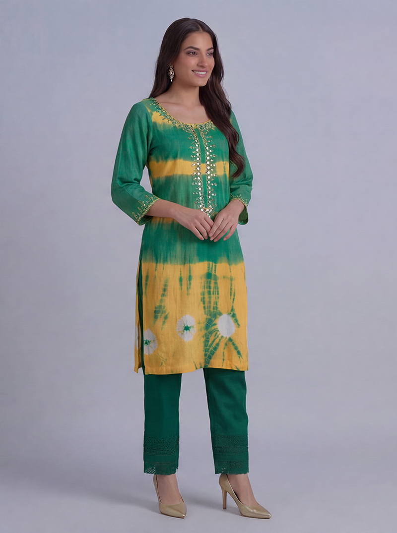 Green and Yellow Tie Dye, linen tie-dye shirt with mirror embroidery work