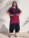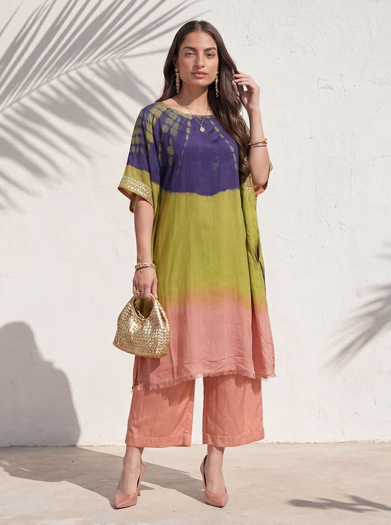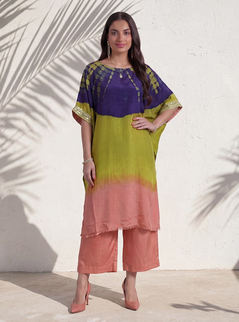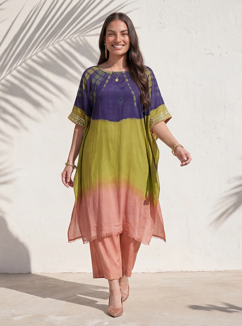 Tie-dye kaftan outfit crafted in luxurious Russian silk featuring embroidered sleeve detailing and paired with wide-leg trousers. A relaxed yet elegant festive ensemble perfect for Eid celebrations and stylish daytime gatherings.