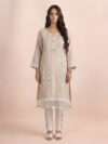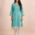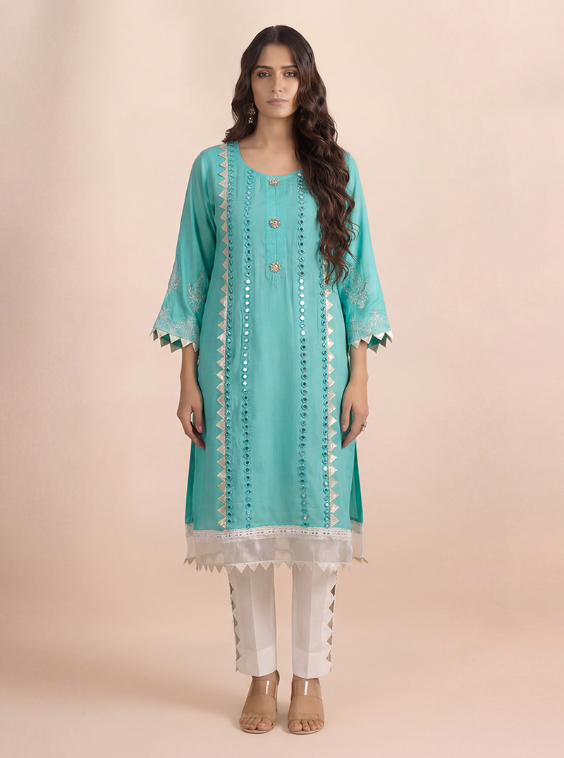 Turquoise linen thread and mirror work embellished ready to wear kurta